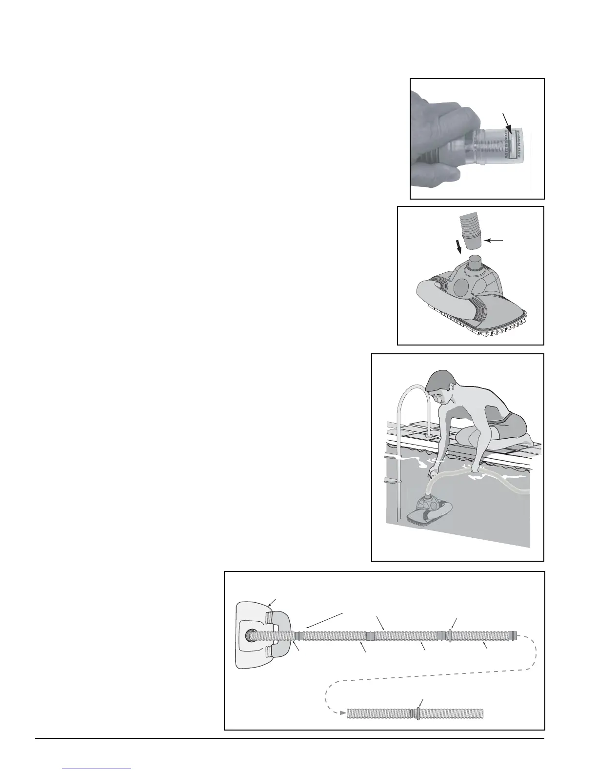 hose attached) and attach the “leader” hose to the cleaner’s swivel.