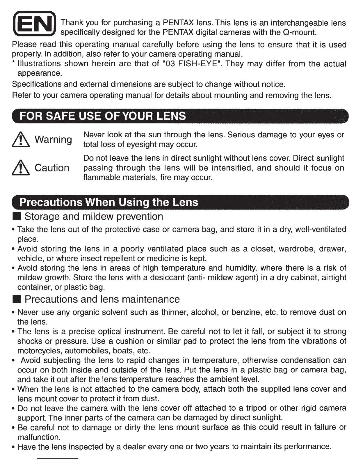 Thank you for purchasing a PENTAX lens. This lens is an interchangeable lens
