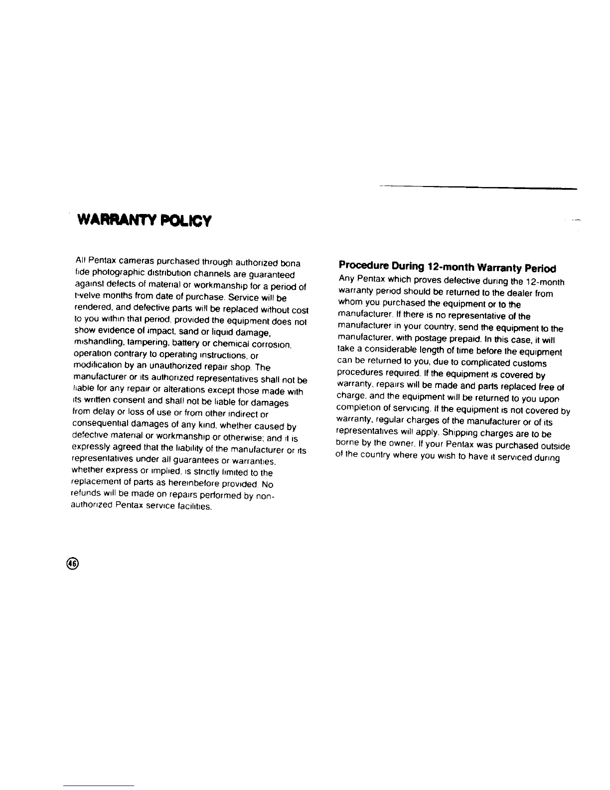 Pentax 105 Super - Warranty Information; Warranty Policy