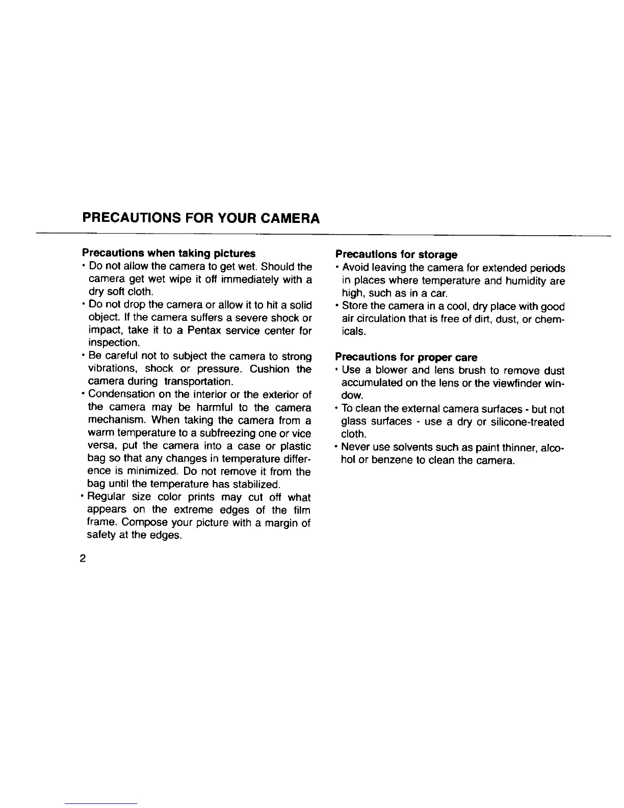 Pentax 145M Super - Precautions for Your Camera; Precautions When Taking Pictures