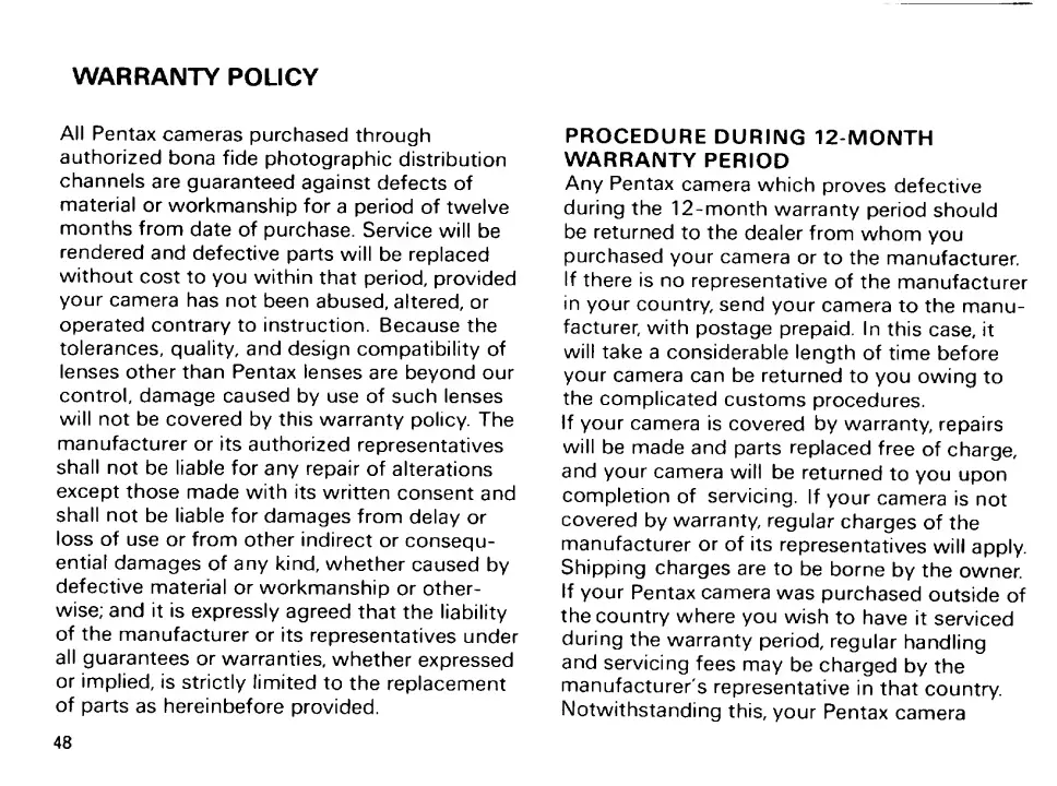 Pentax 67 - Pentax Warranty Policy