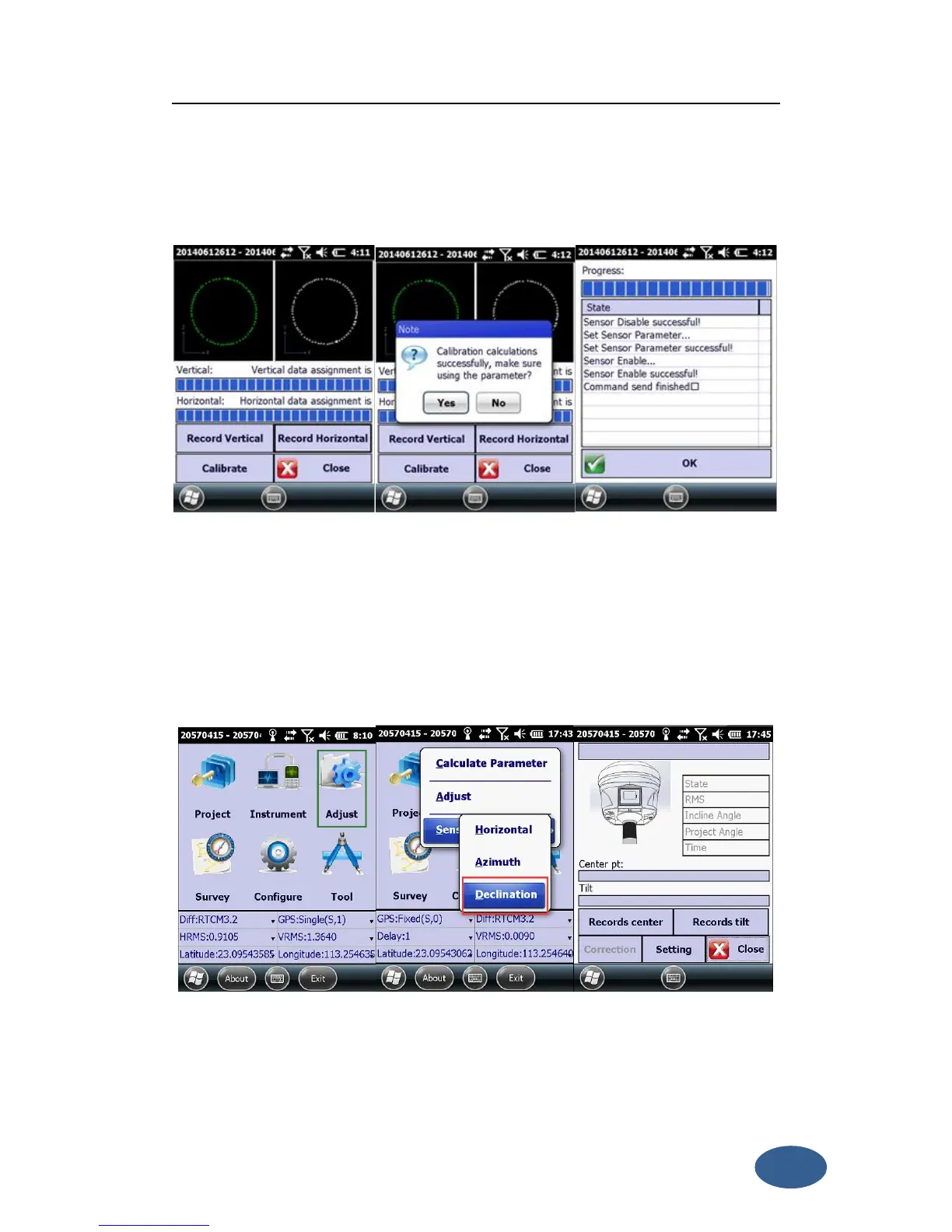 step—“Declination Calibration”. Click “Adjust—Sensor Calibrate—Declination” to