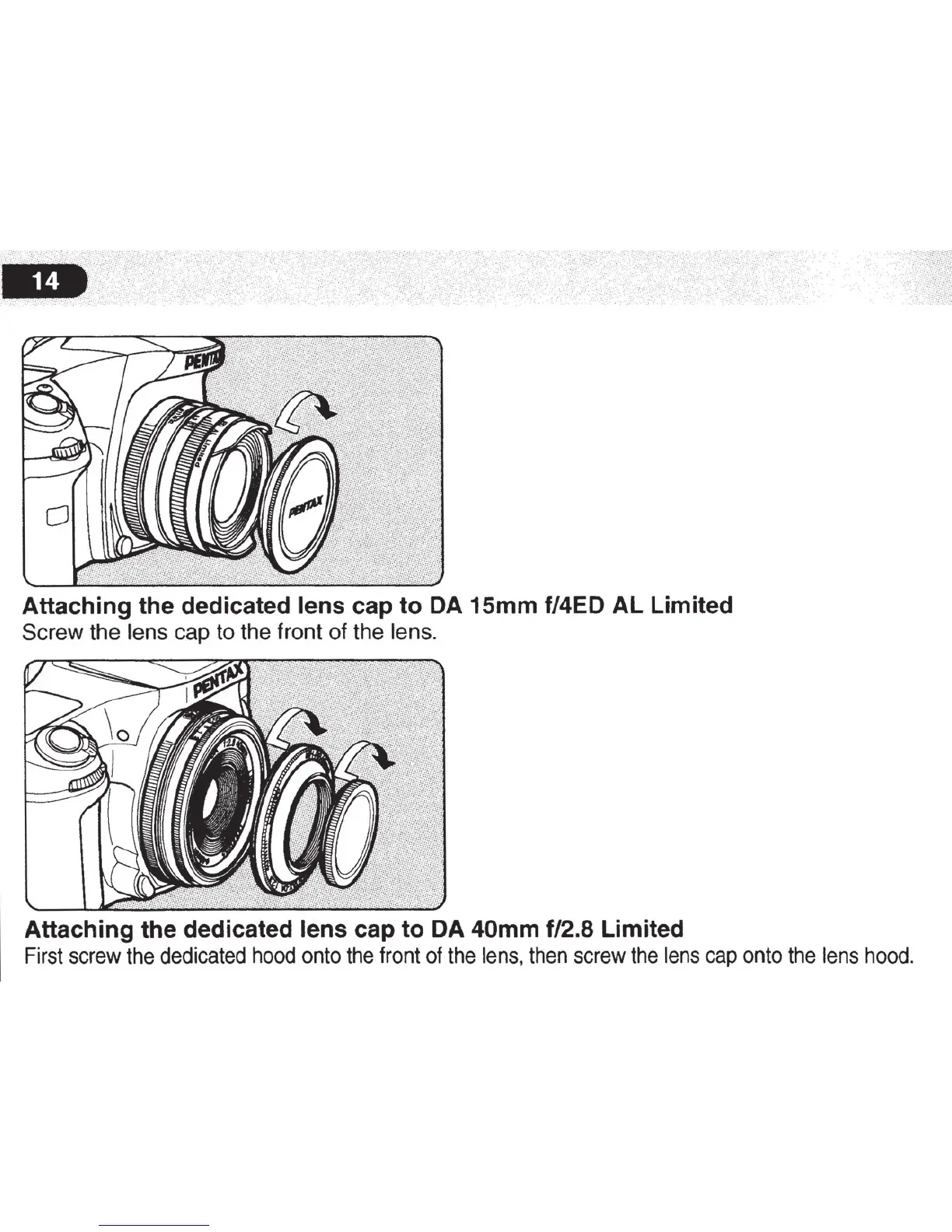 Pentax K-30 - Attaching the Dedicated Lens Cap to da 15 Mm F;4 Ed al Limited; Attaching the Dedicated Lens Cap to da 40 Mm F;2.8 Limited