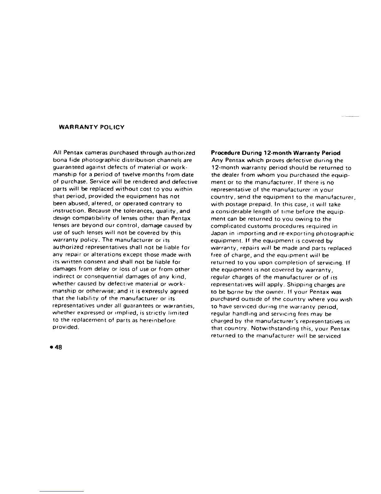 Pentax MG - Warranty Policy; Procedure During 12-month Warranty Period