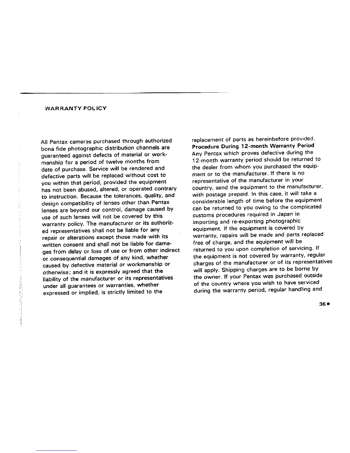 Pentax MX - Pentax MX Warranty Policy