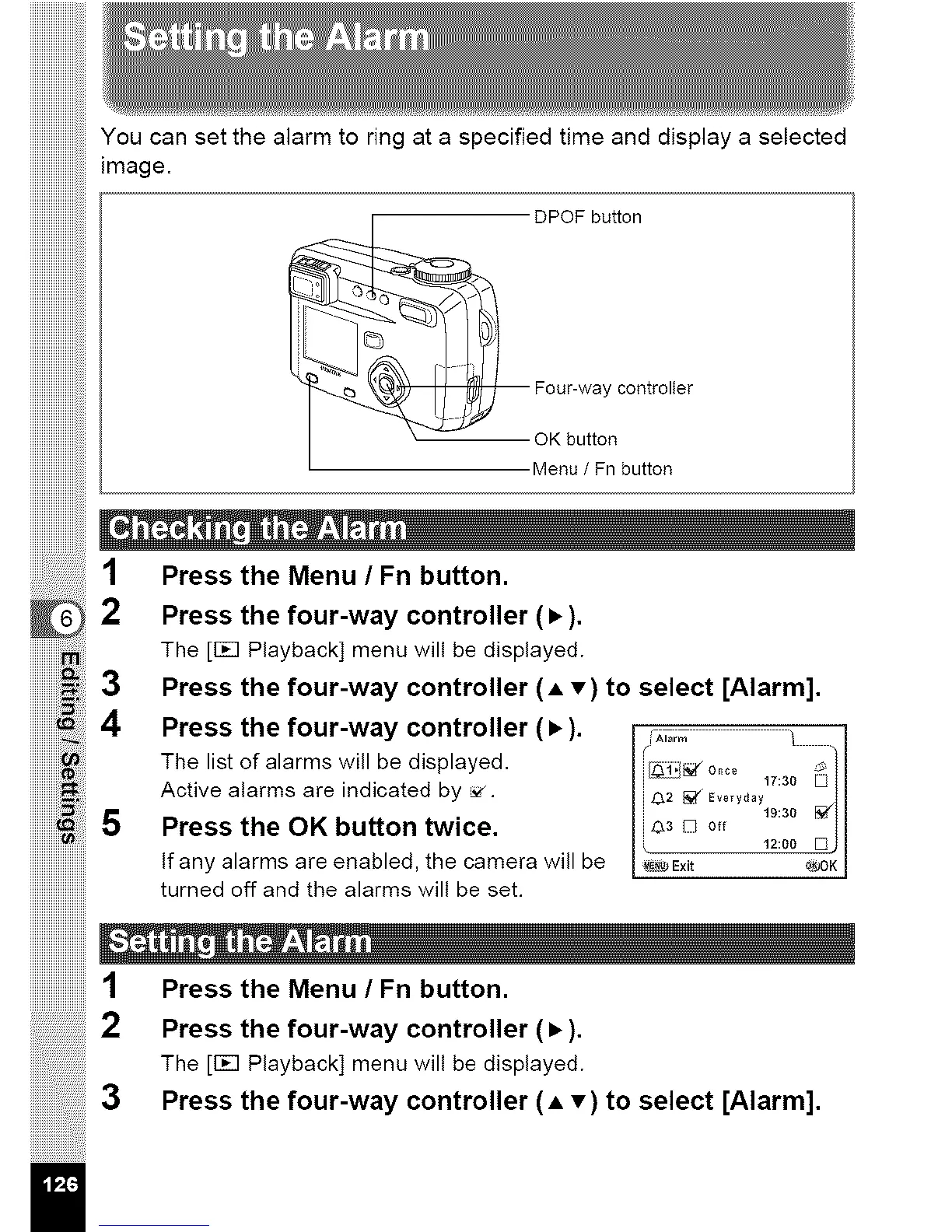 Press the four-way controller (A T) to select [Alarm].