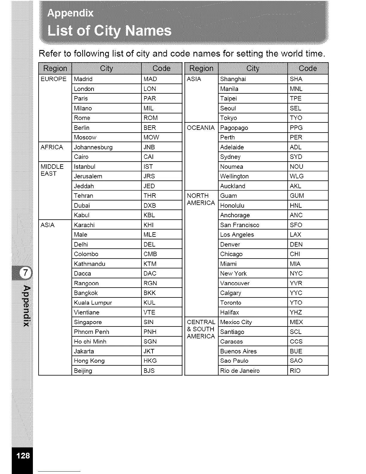 Refer to following list of city and code names for setting the world time.