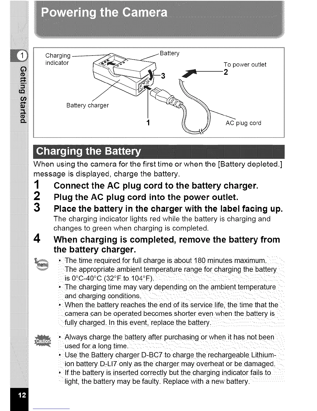 • Use the Battery charger D-BC7 to charge the rechargeable Lithium-
