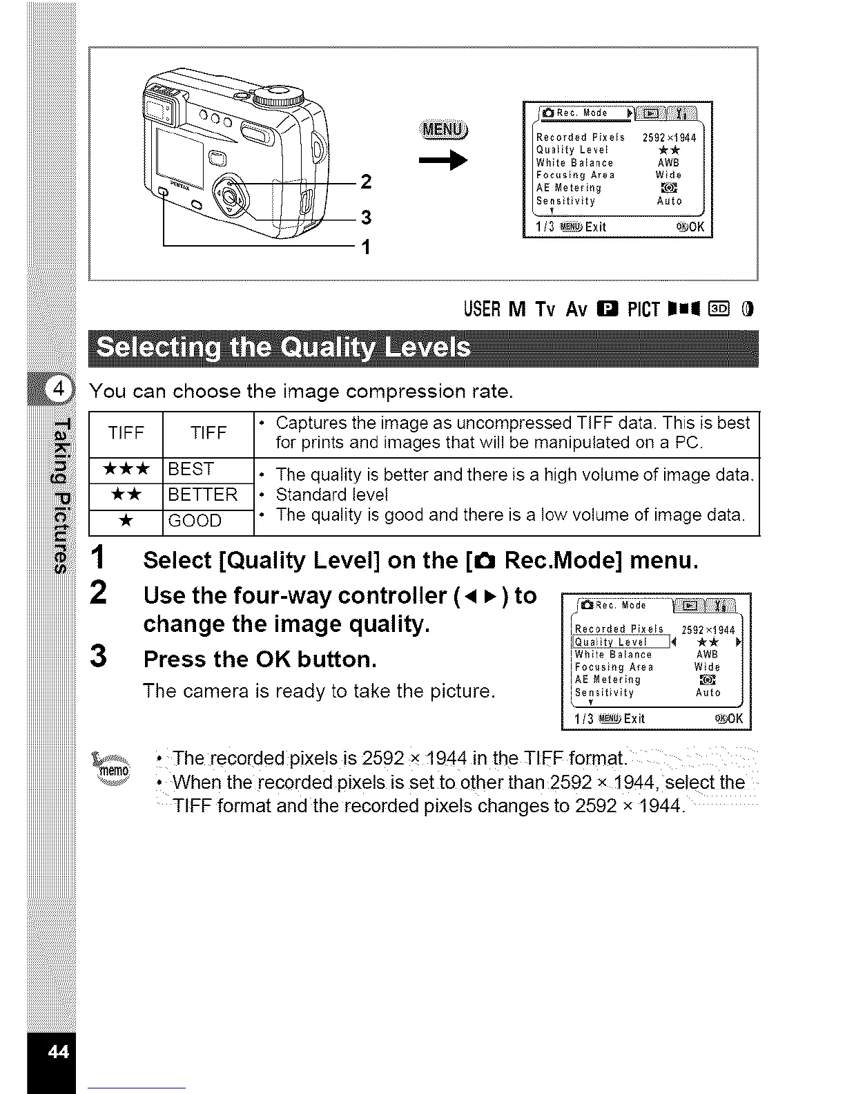 TIFF format and the recorded pixels changes to 2592 x 1944.