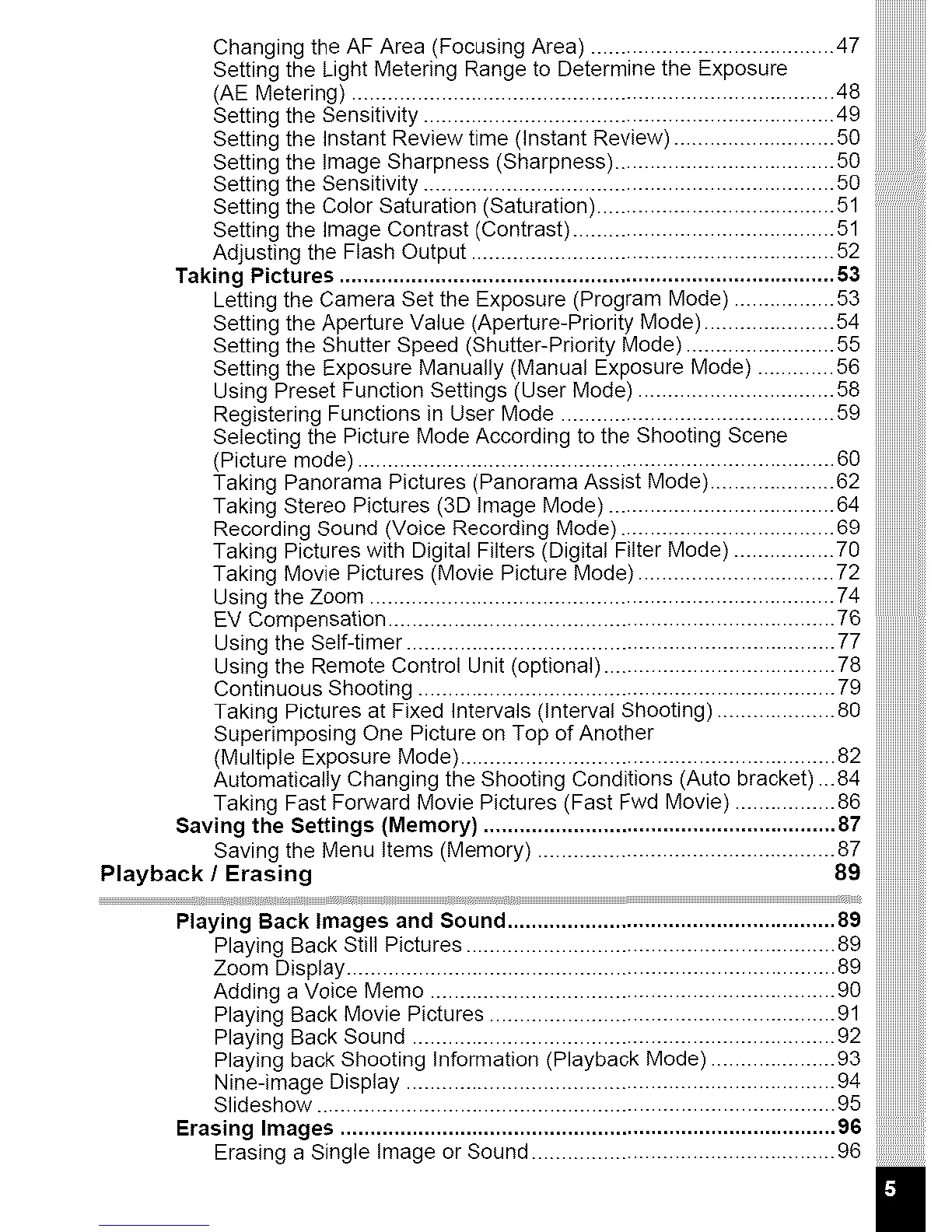 Changing the AF Area (Focusing Area) ......................................... 47