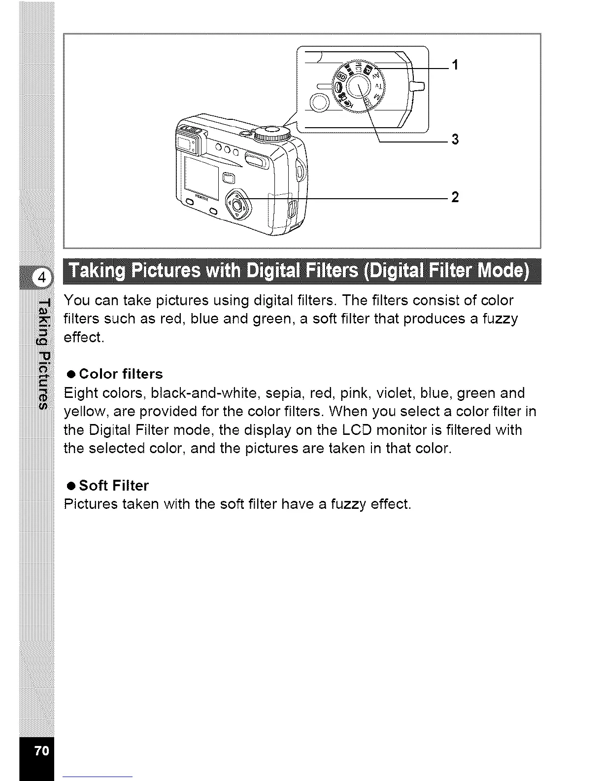 filters such as red, blue and green, a soft filter that produces a fuzzy