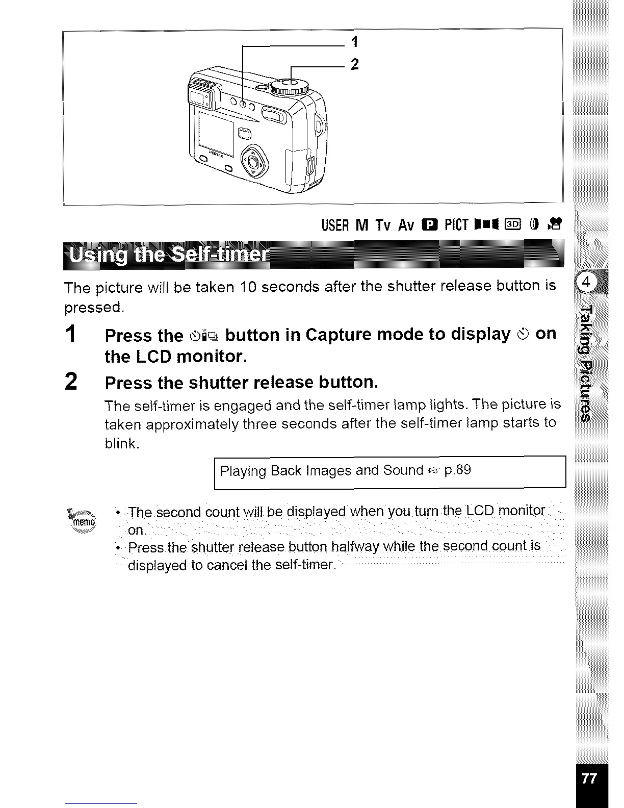 The picture will be taken 10 seconds after the shutter release button is