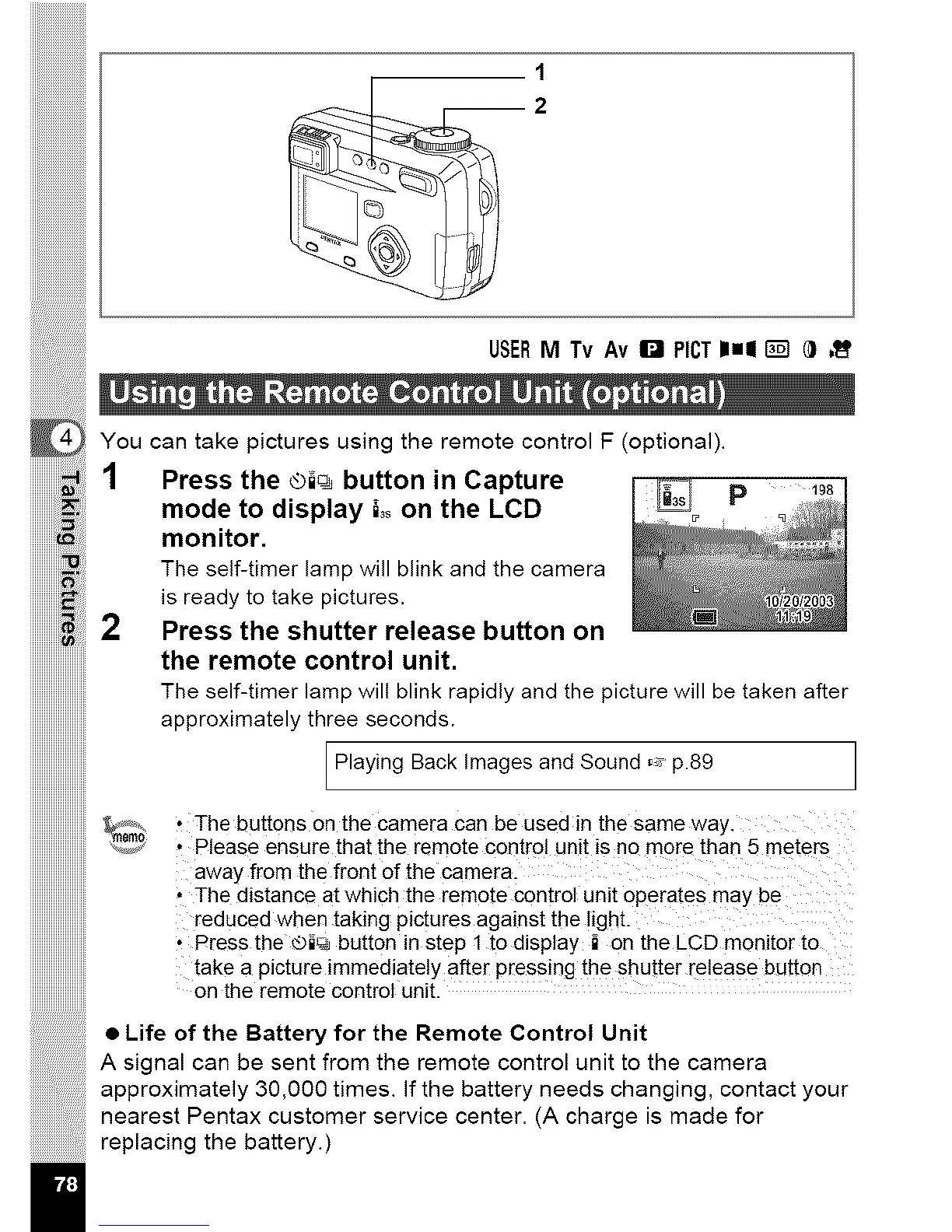 You can take pictures using the remote control F (optional).