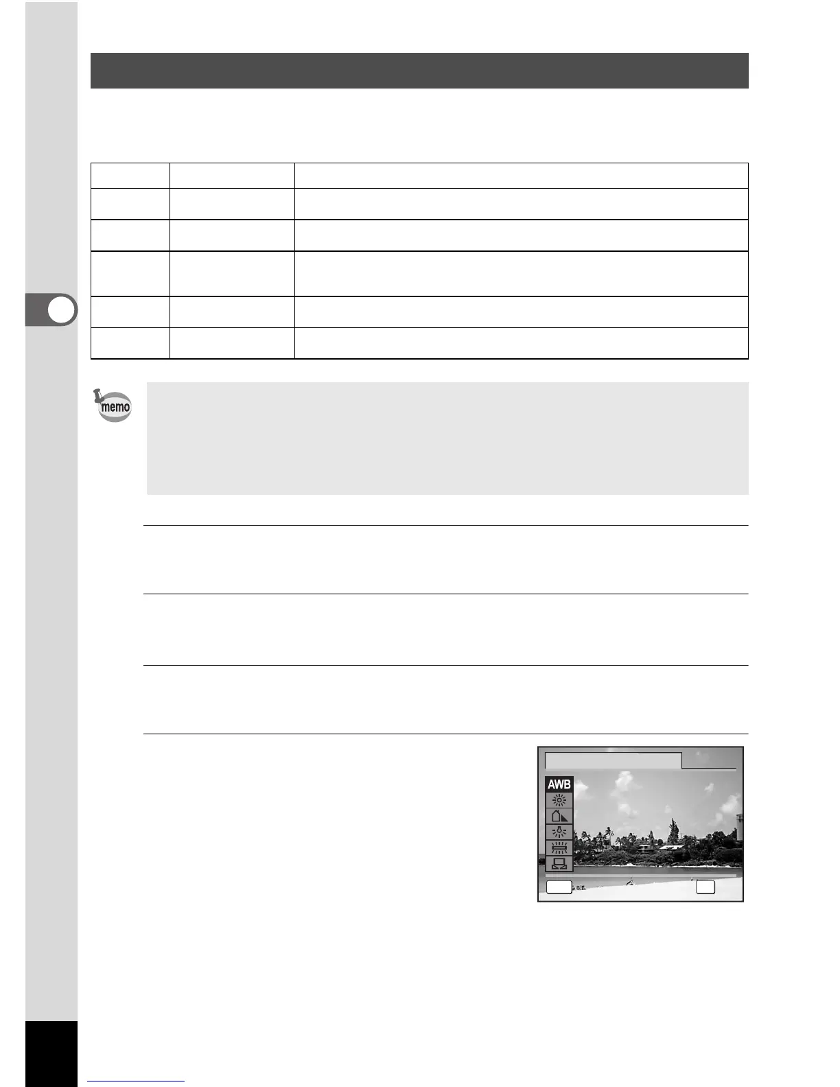 Manual Use this mode when adjusting the white balance manually.