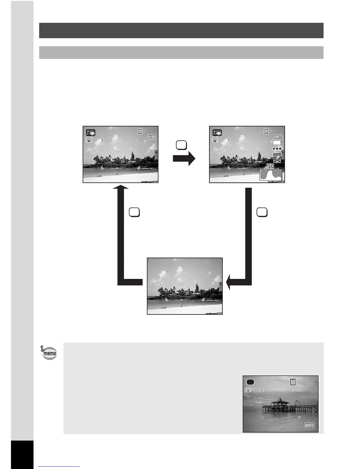 4/W button: Normal Display, Histogram + Info, No Info.