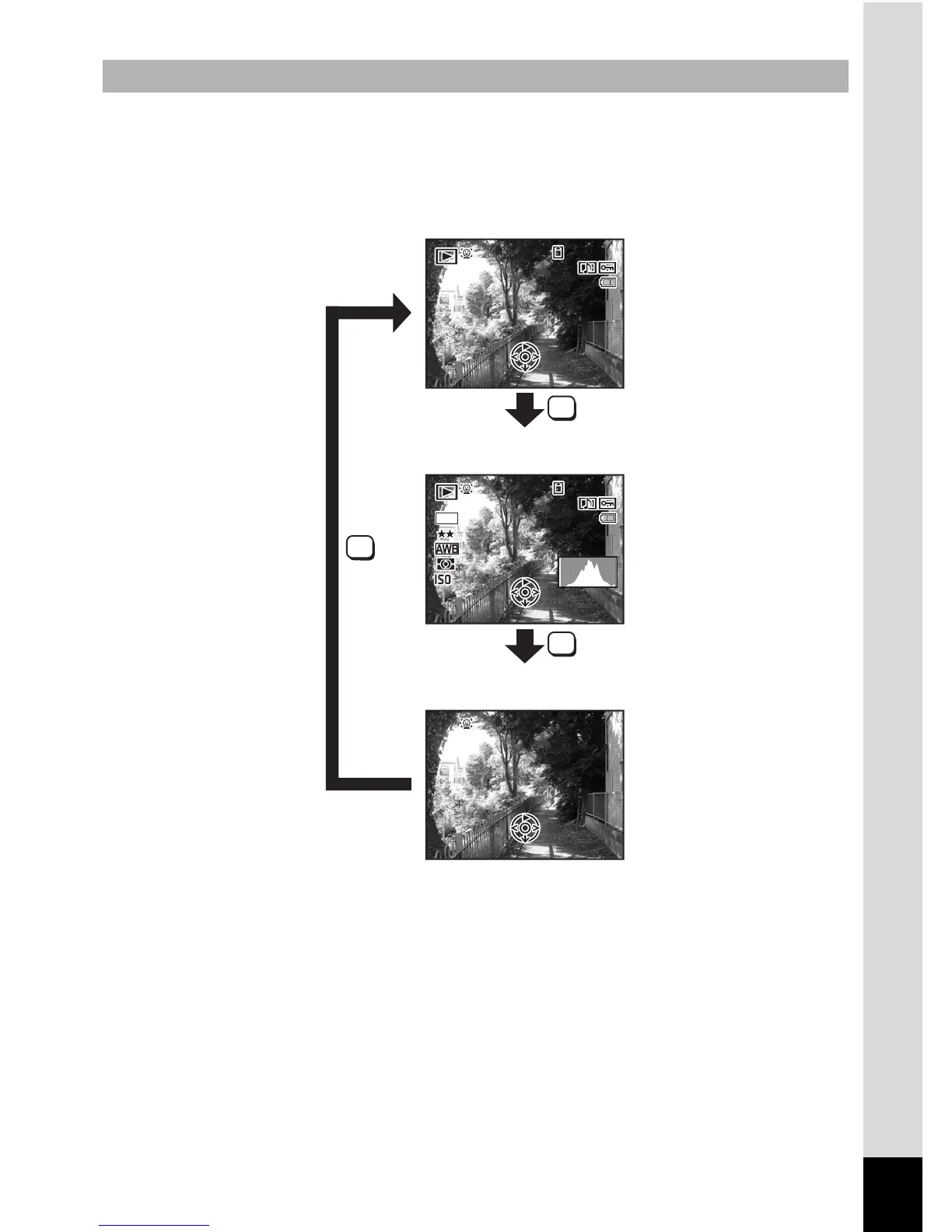 the 4/W button: Normal Display, Histogram + Info, No Info.