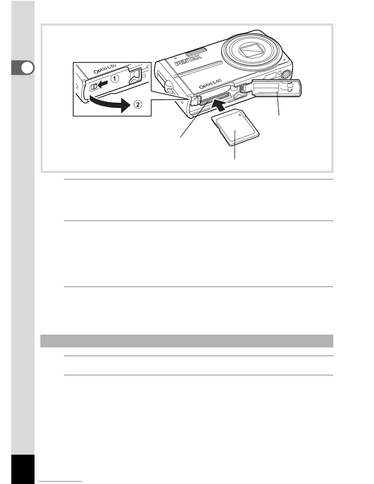 Move the battery/card cover lock lever to the OPEN position 1 and
