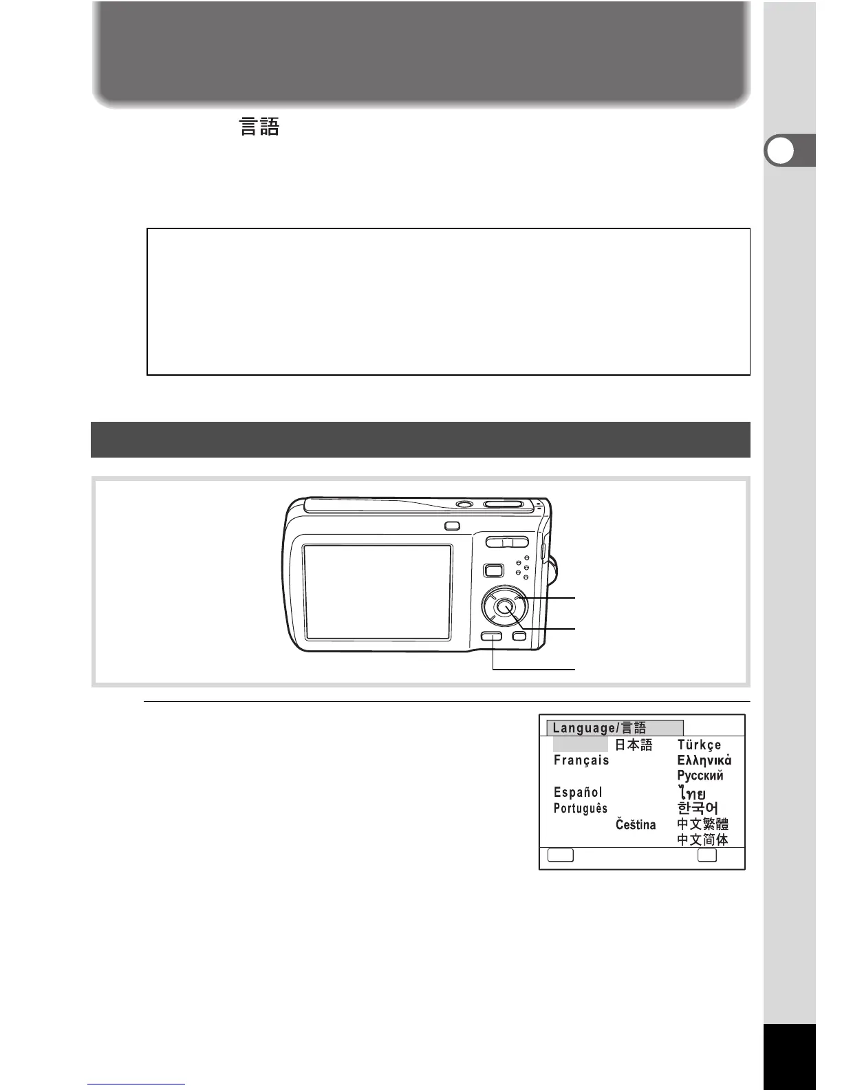 below to set the language, and in “Setting the Date and Time” (p.43) to