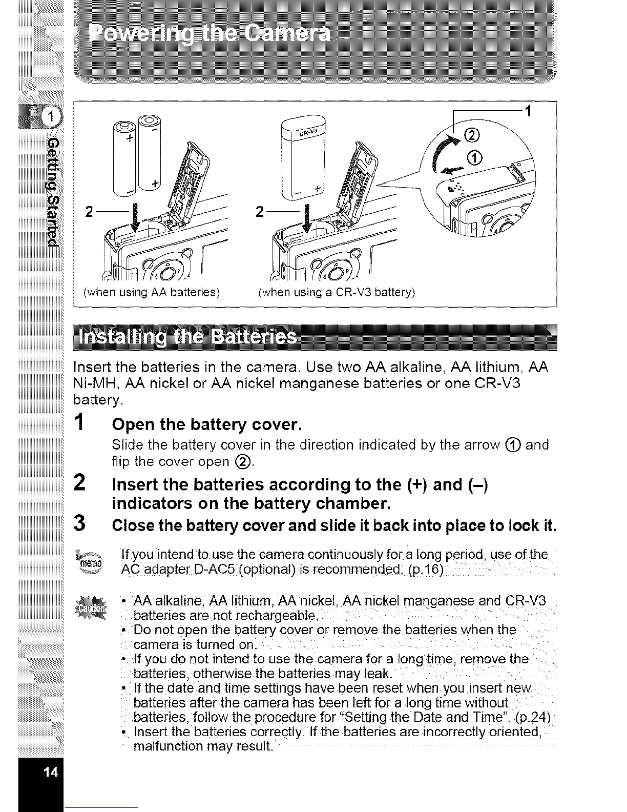 AC adapter D-AC5 (optional) is recommended. (p.16)
