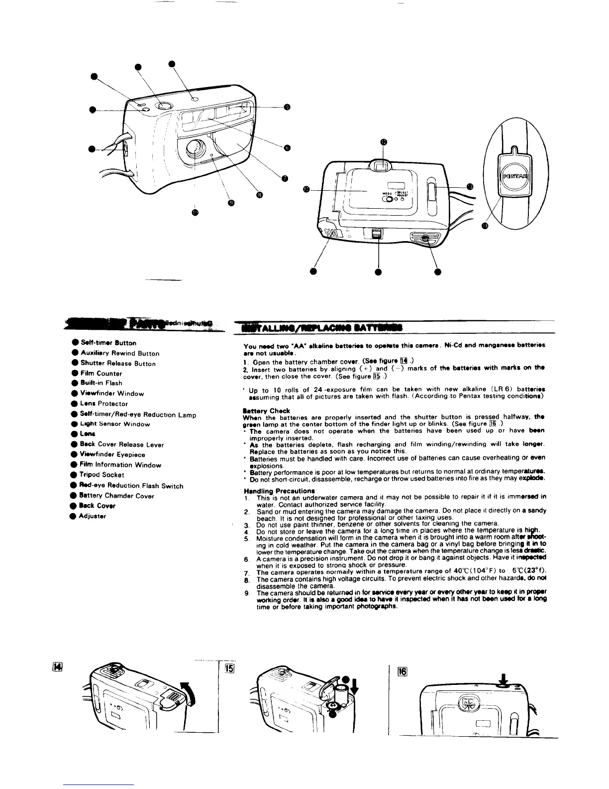 Pentax PC-300 DATE - Installing and Replacing Batteries; Battery Check; Handling Precautions