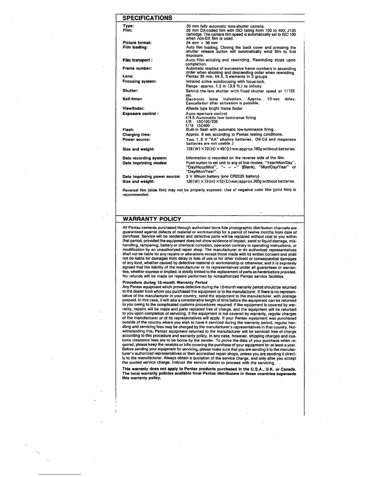 Pentax PC-50 DATE - Specifications; Warranty Policy; Procedure during 12-month Warranty Period