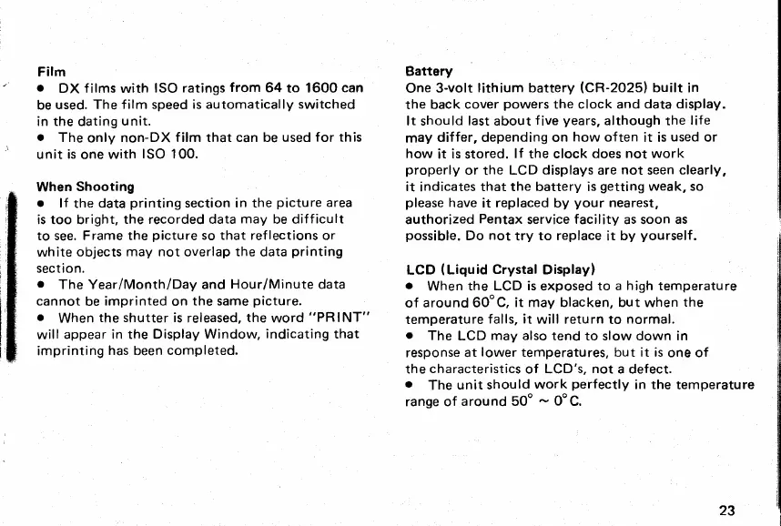 Pentax PC-555 - Film Compatibility for Date Imprinting; Shooting Tips for Data Imprinting; Battery for Clock and Data Display; LCD Performance and Temperature Effects