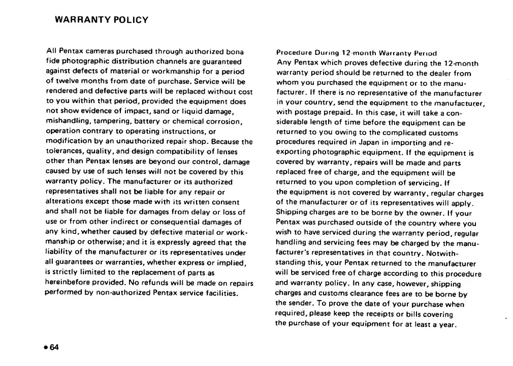 Pentax SF1 - Warranty Policy