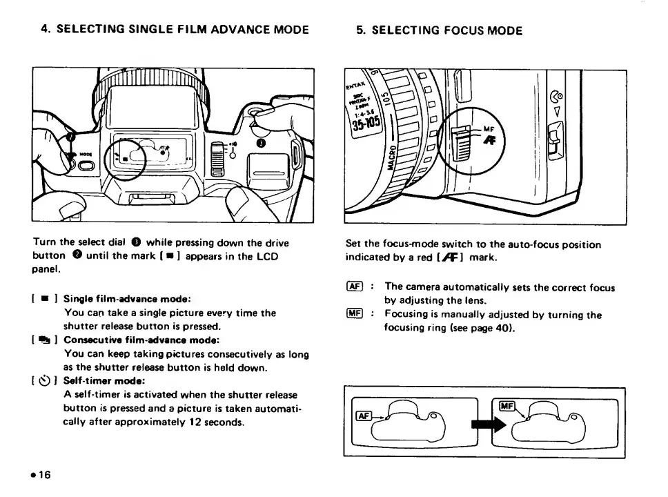 Pentax SF10 - Selecting Single Film Advance Mode; Selecting Focus Mode