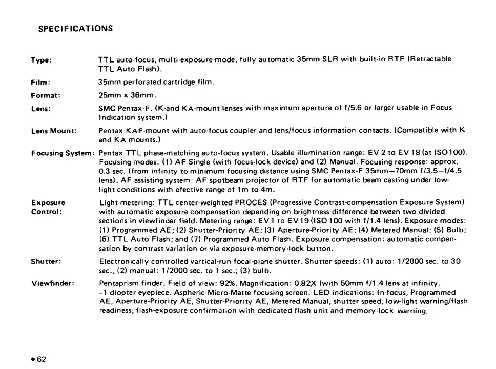 Pentax SF10 - Specifications
