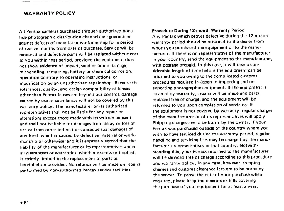 Pentax SF10 - Warranty Policy