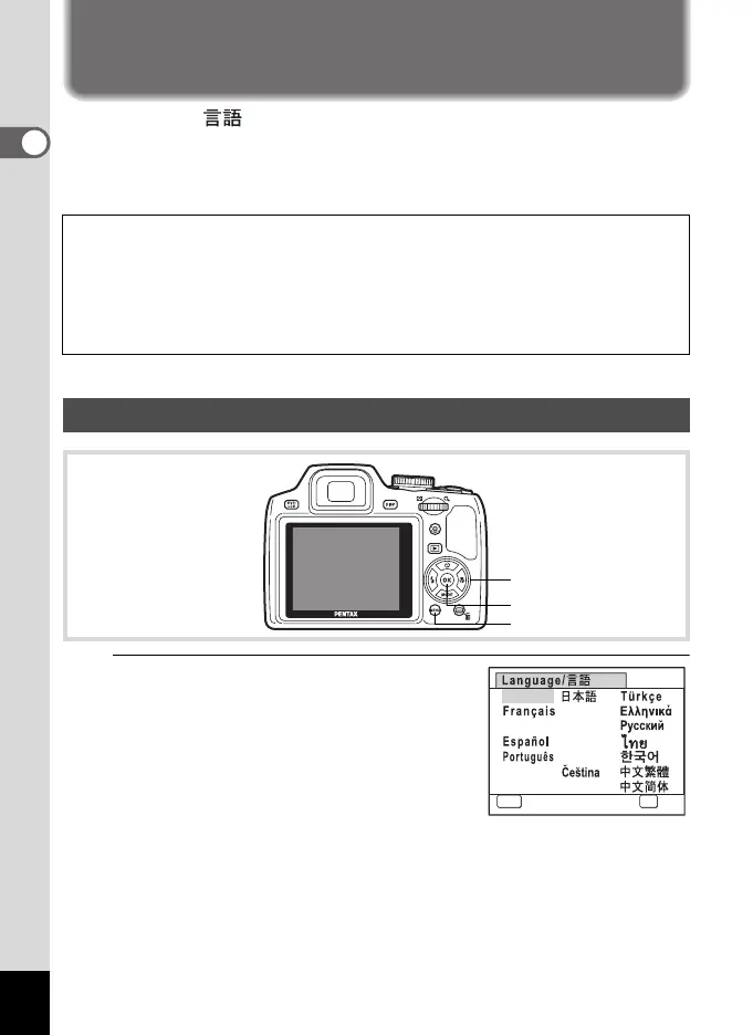 below to set the language, and in “Setting the Date and Time” (p.44) to