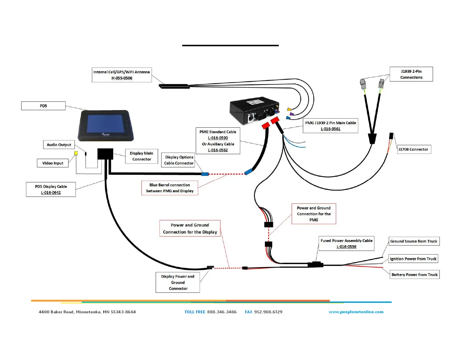 peoplenet PD5 - System Overview: PD5 connected to a PMG; PD5 Display Cable; PMG Standard or Auxiliary Cable; PMG J1939 2 Pin Main Cable