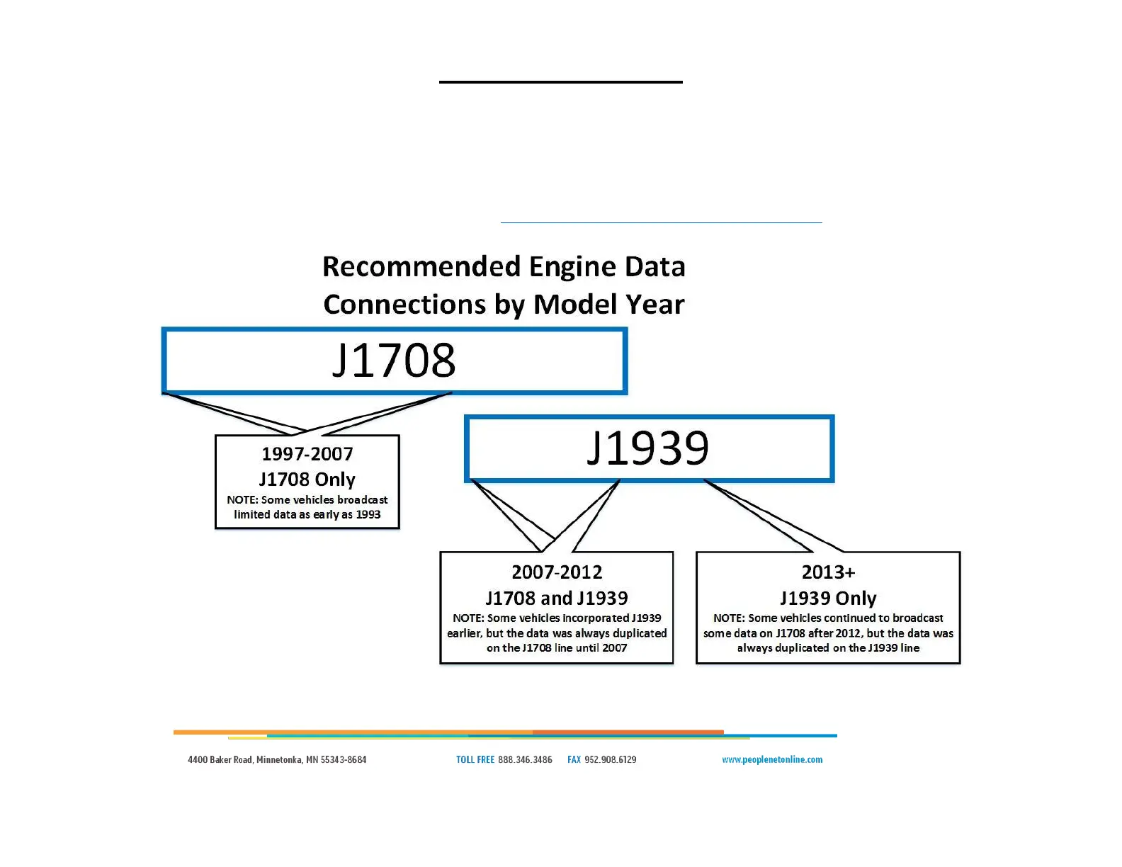 The proper J1708 and J1939 engine data connection points are outlined in documents available on PeopleNet Online Support Center