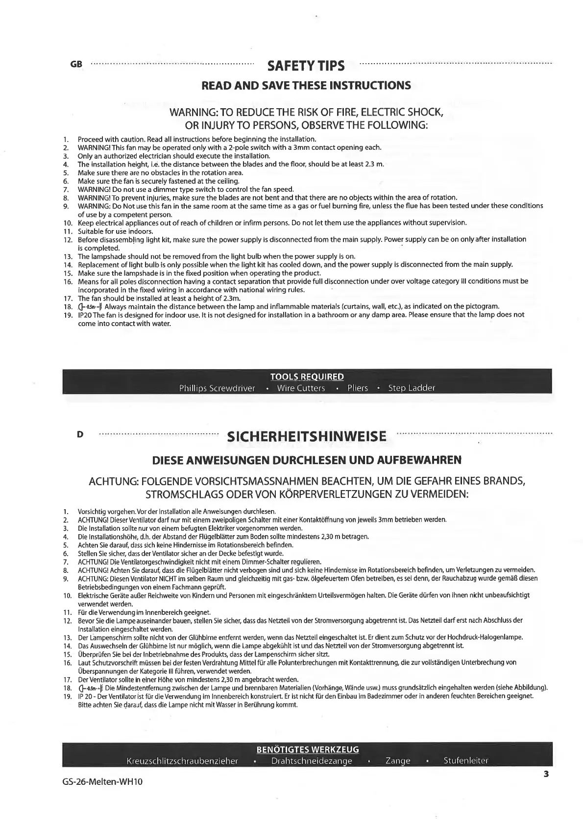 9. ACHTUNG: D¡esen Ventilator NICHT im selben