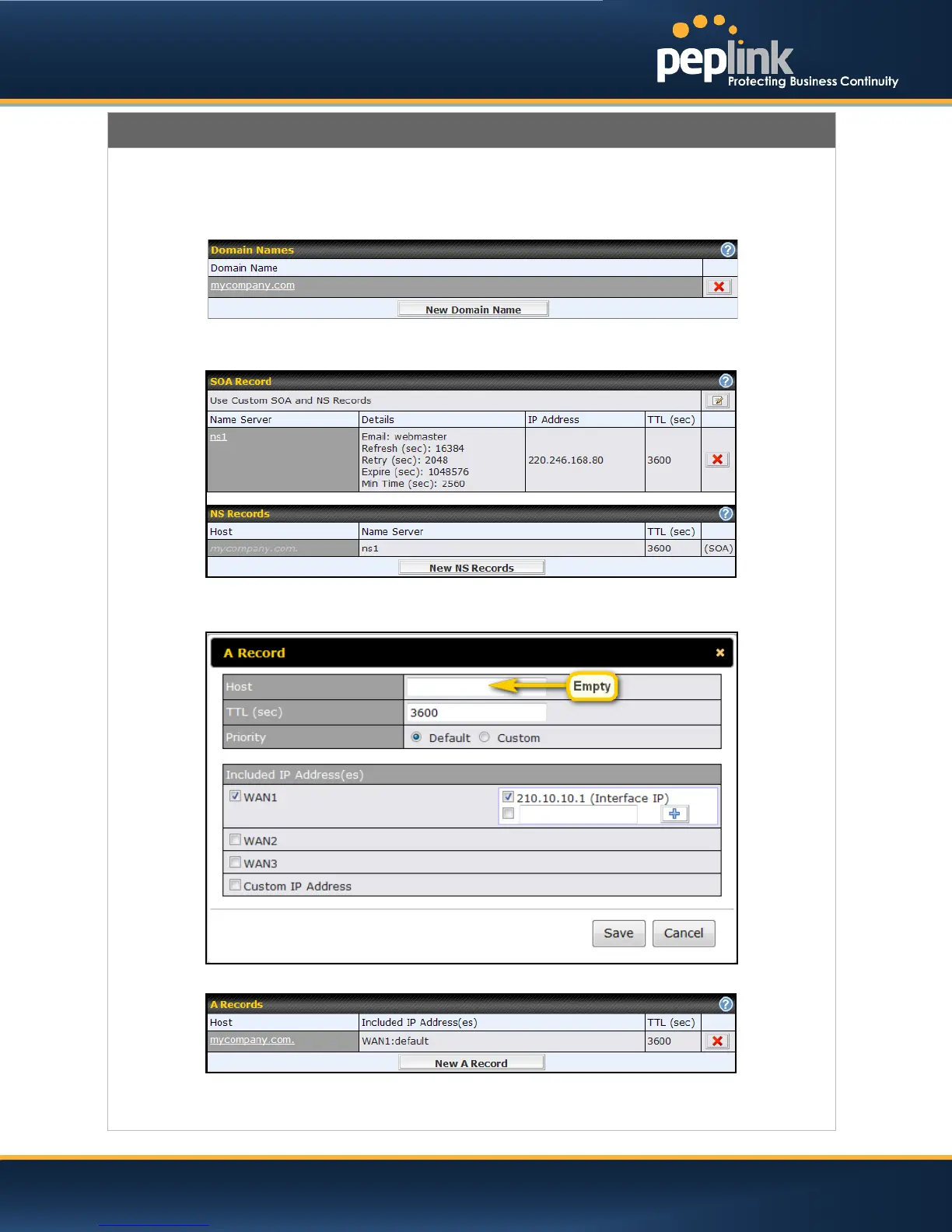 • Create SOA/NS records named ns1, ns2, etc. The IP addresses are the Balance’s DNS server addresses.