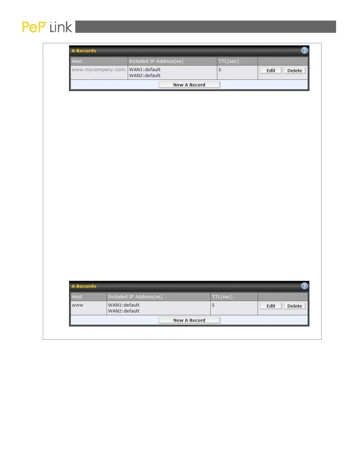 of PePLink Balance, respectively. The values of the IP addresses are fictitious and for