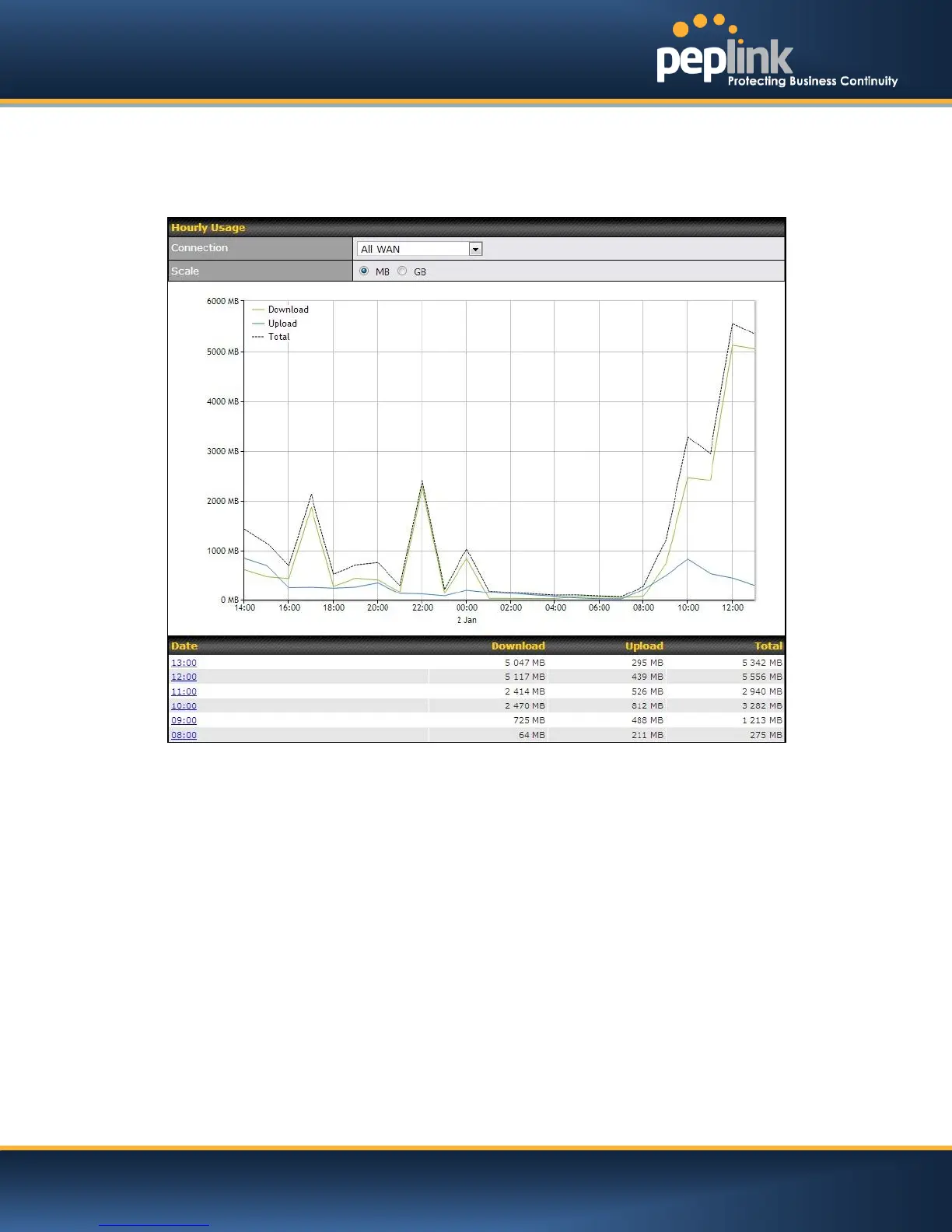 This page shows the hourly bandwidth usage for all WAN connections, with the option