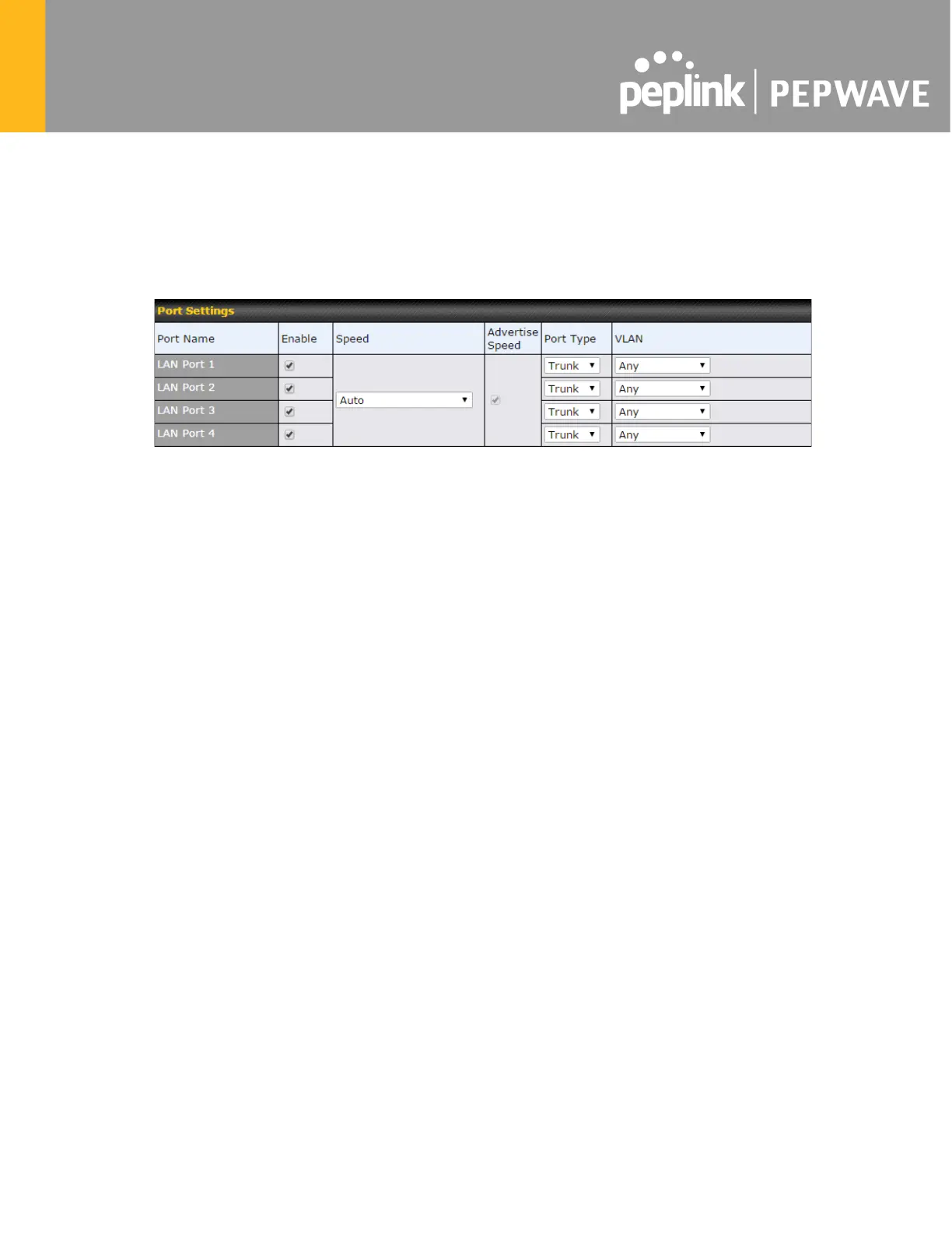 On this screen, you can enable specific ports, as well as determine the speed of the LAN ports,