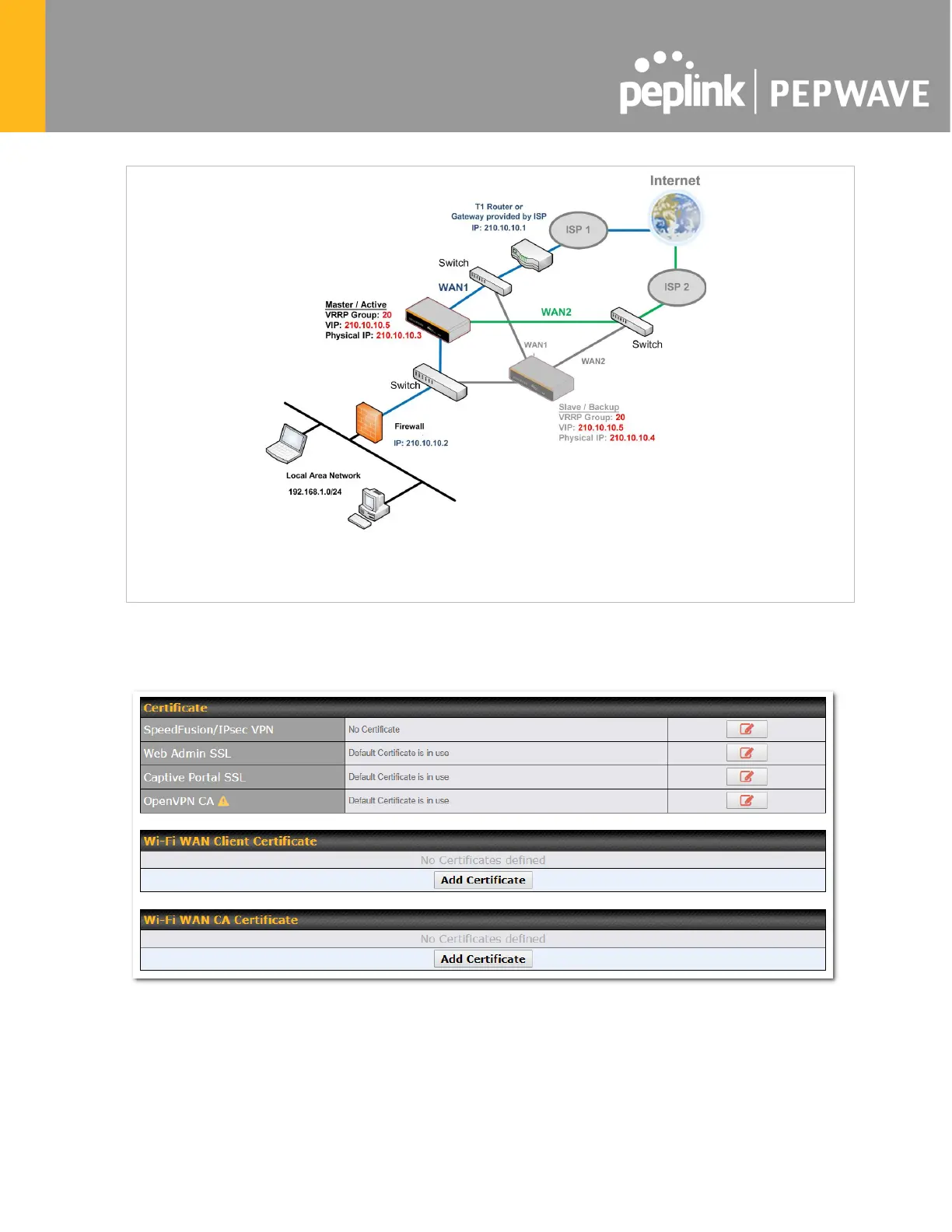 Portal SSL, OpenVPN CA, Wi-Fi WAN Client certificate and Wi-Fi WAN CA Certificate.