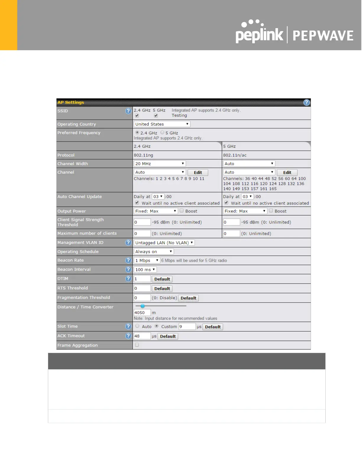 On many Pepwave models, the AP settings screen (AP>Settings) looks similar to the example