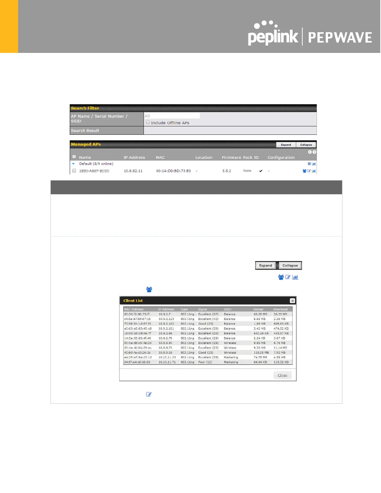 of clients, upload traffic, and download traffic. Click the blue arrows at the left of
