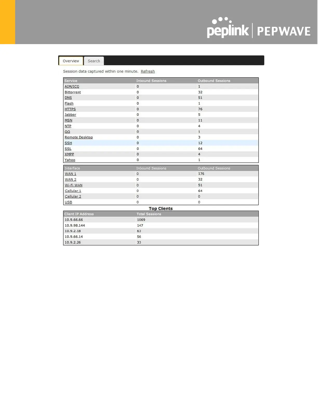 each WAN port. In addition, you can see which clients are initiating the most sessions.