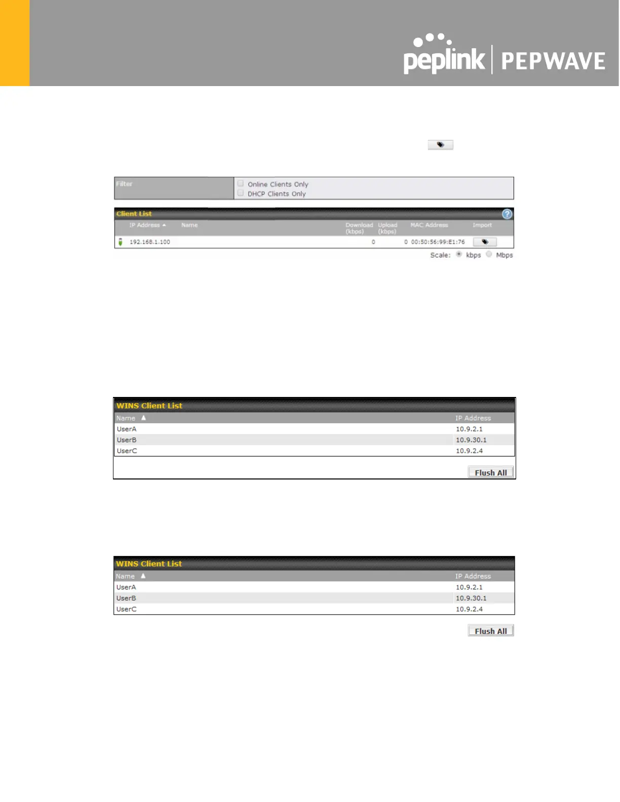 The WINS client table lists the IP addresses and names of WINS clients. This option will only
