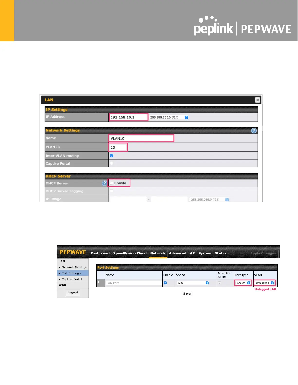 5. Set the Port Type to Access and set VLAN to Untagged LAN (see picture below).
