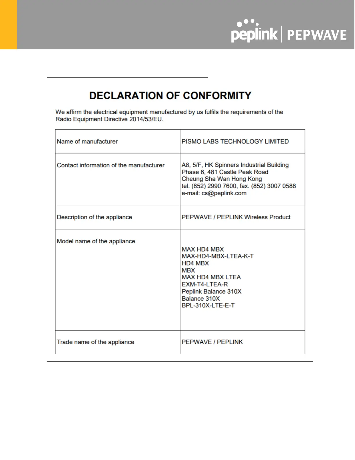 CE Statement for Pepwave Routers ( MAX HD4 MBX )
