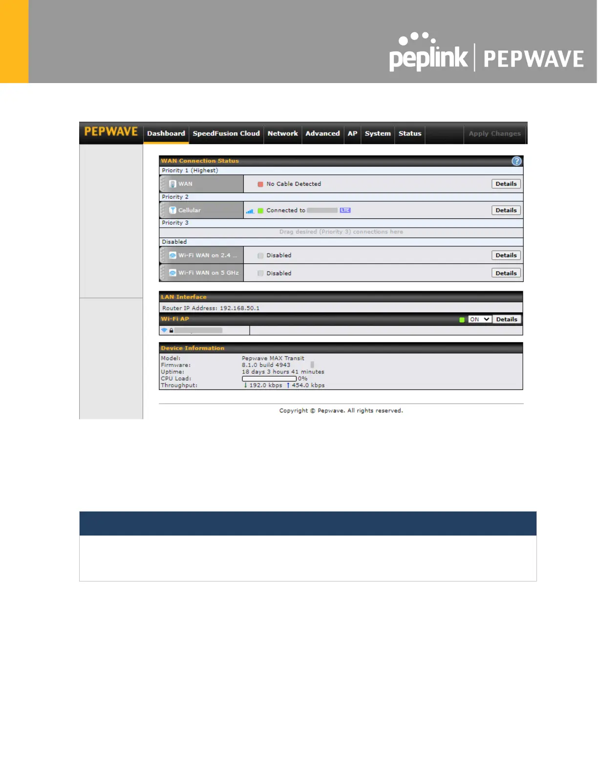 The Dashboard shows current WAN, LAN, and Wi-Fi AP statuses. Here, you can change WAN