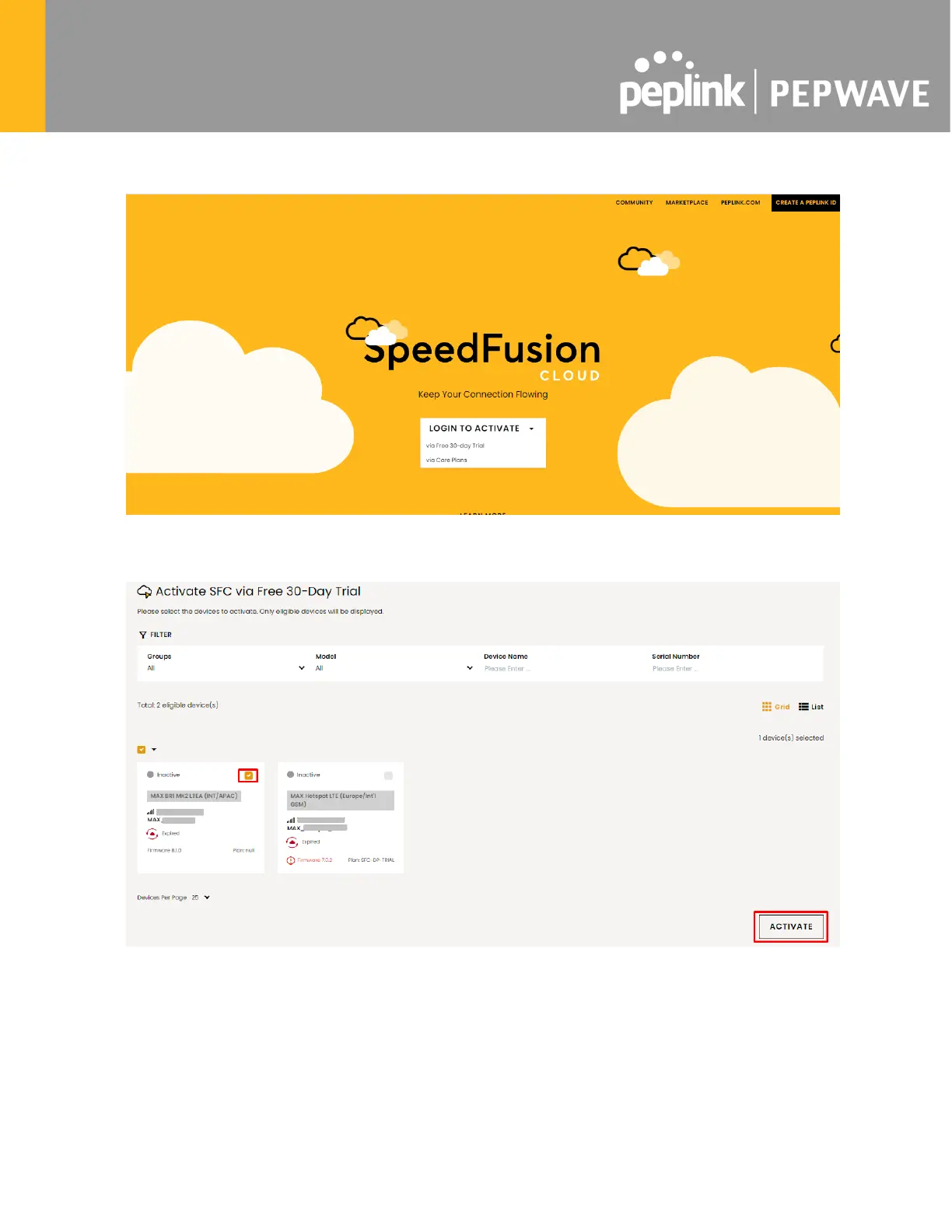 Select the devices that you wish to activate SpeedFusion Cloud on and Click ACTIVATE.