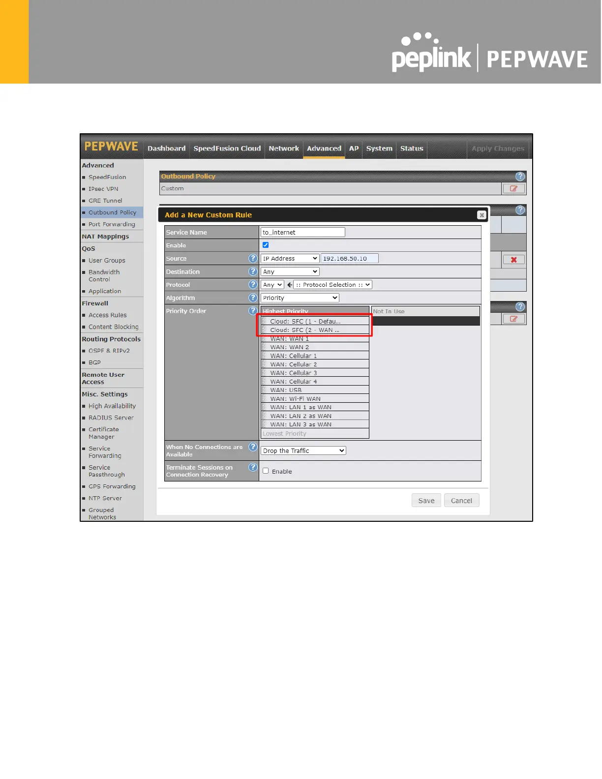 Create an outbound policy to steer the internet traffic to go into Speedfusion Cloud. Please go