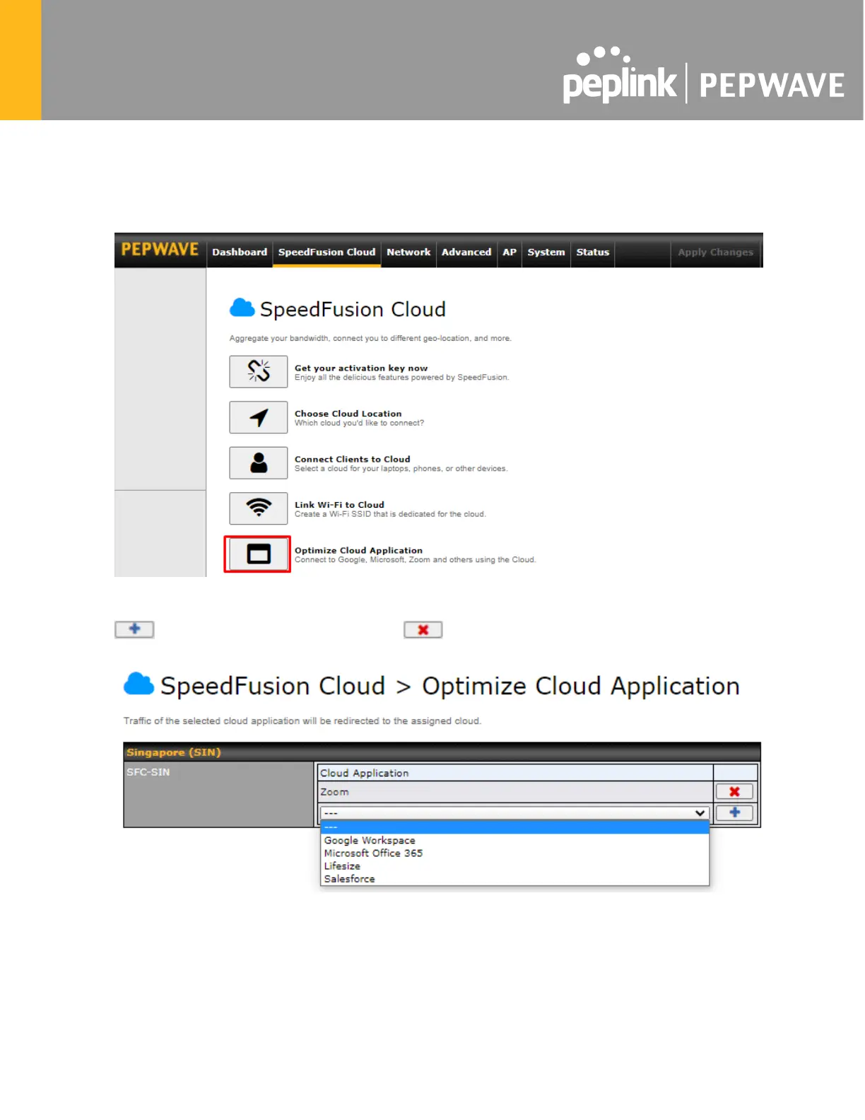 the application. Go to SpeedFusion Cloud > Optimize Cloud Application.