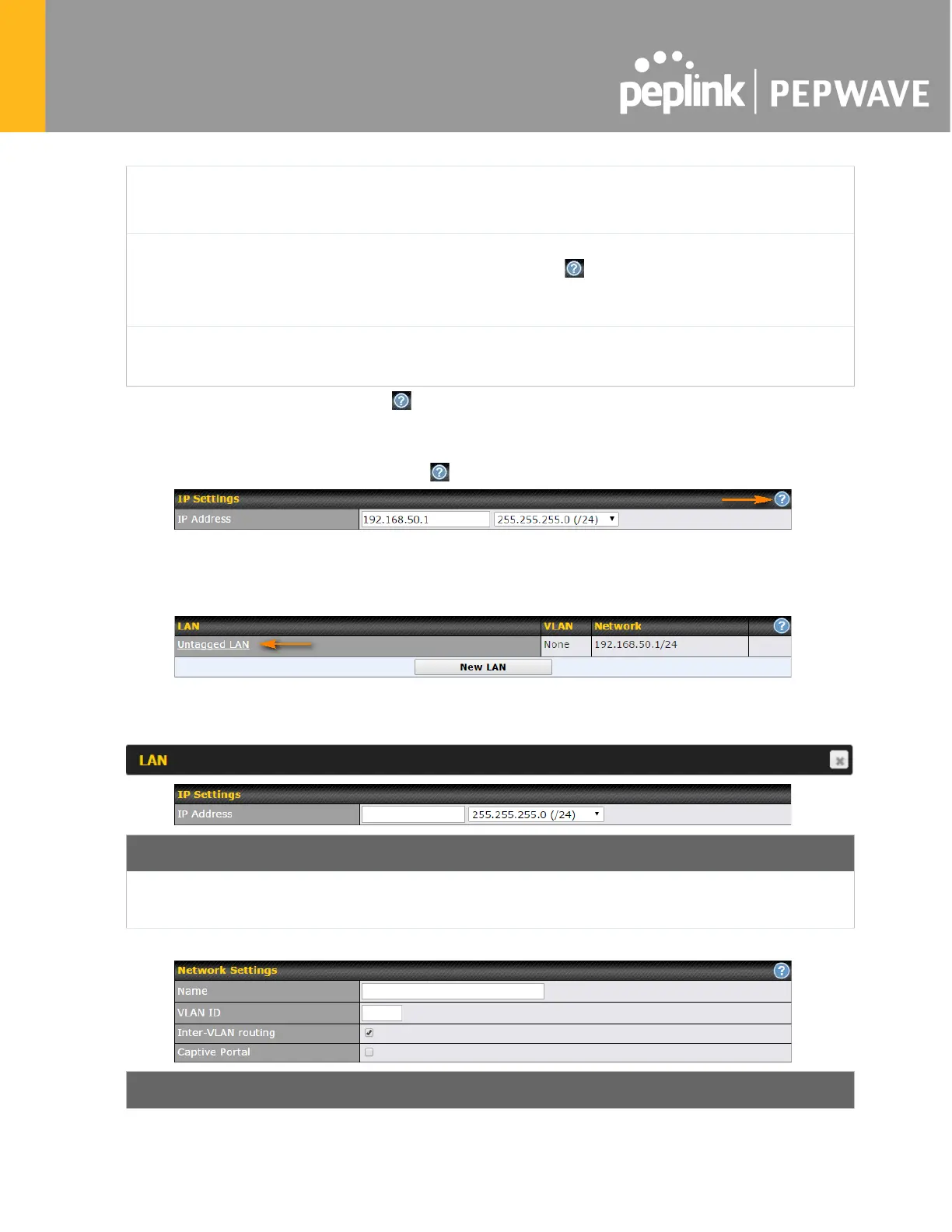 Enter the Pepwave router’s IP address and subnet mask values to be used on the